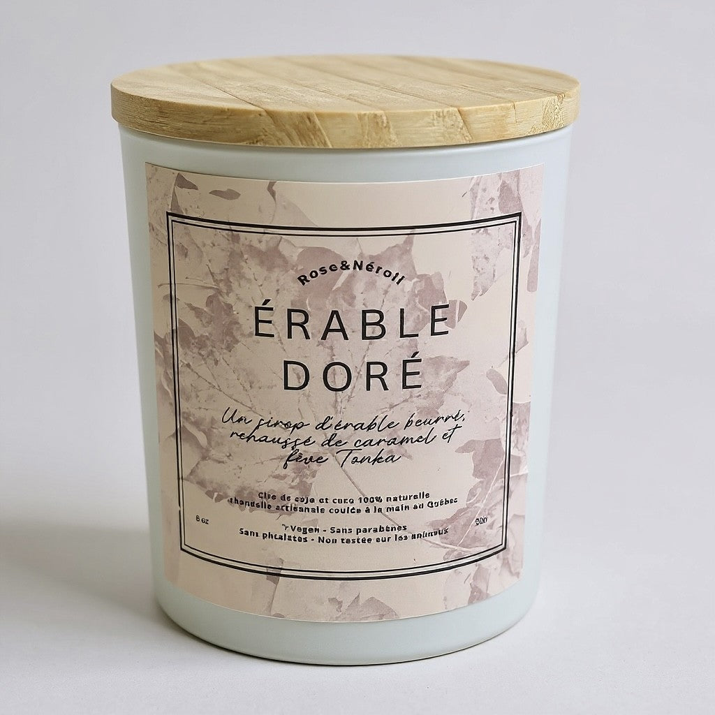 Érable doré est une chandelle artisanale coulée à la main avec un mélange raffiné. de cire de soya et de coco.