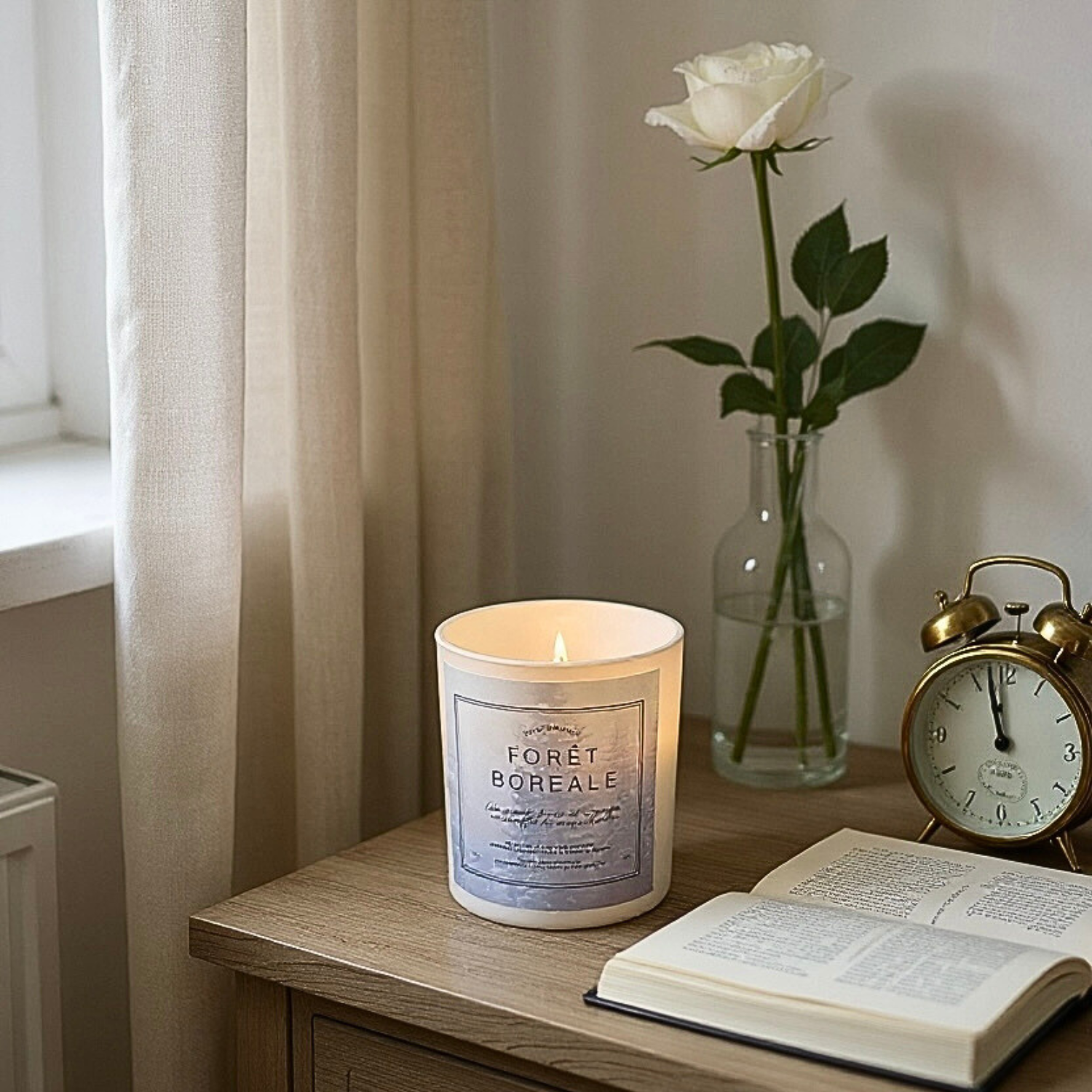 Forêt boréale est une chandelle artisanale coulée à la main avec un mélange raffiné de cire de soya et de coco.