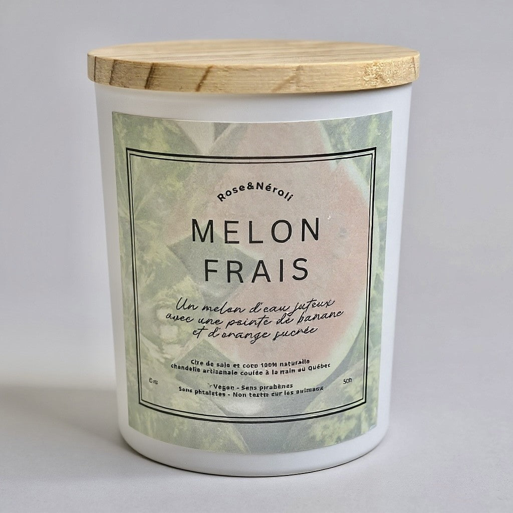 Melon frais est une chandelle artisanale coulée à la main avec un mélange raffiné de cire de soya et de coco.